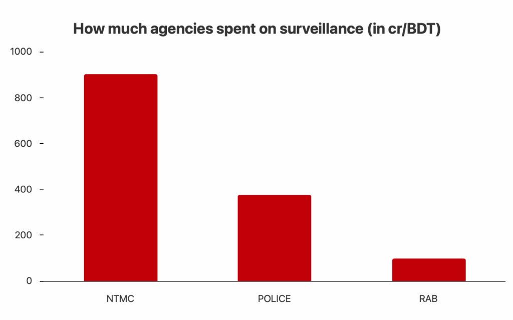 Of the Tk 1,382 crore spent on surveillance equipment by NTMC, police and Rab between 2016 and 2024, NTMC’s expenditure alone accounted for more than 65 percent (Tk 904.39 crore).