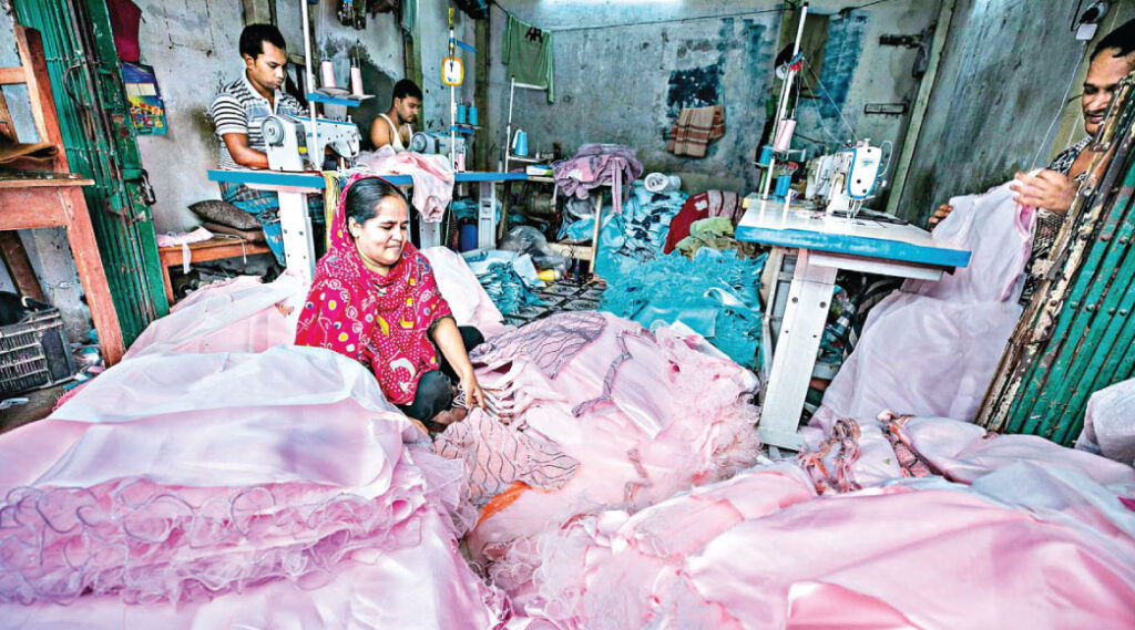 The ringing sound of hundreds of sewing machines floats through Khalifa Patti in Chattogram every year before Eid-ul-Fitr. At least eight to ten people are hard at work round the clock in every shop of the market.